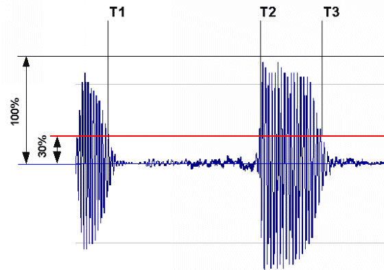Технология VAD (упоминалась в http://www.ixbt.com/comm/ip-tele-troubles.html) используется совместно с большим числом речевых кодеков. Попытаюсь кратко проиллюстрировать механизм VAD на простейшем примере (см. рис. 5). Входной аналоговый сигнал поступает на вход устройства сравнения, в котором измеряется его амплитуда и сравнивается с заданным пороговым значением. При превышении амплитудой входного сигнала заданного порога (красная линия на рис. 5), сигнал поступает на вход кодека и кодируется по определённому алгоритму (интервал Т 2–Т 3). Если амплитуда входного сигнала ниже порогового значения (например в интервал Т 1–Т 2), то в момент времени Т 1 передаётся только служебная информация (длиной в несколько бит) о начале паузы, а в момент Т 2 о её окончании. На приёмной стороне, во время паузы, для улучшения субъективного восприятия кодированной речи может передаваться комфортный шум. Ниже я ещё дополнительно рассмотрю особенности применения технологии VAD.