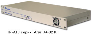IP-АТС серии "Агат UX-3210" — конвергентные среднеканальные мини-АТС, позволяющие организовывать голосовую и факсимильную связь как через обычные телефонные линии (ТфОП), так и через IP-сети (Ethernet, Internet и т.д.). Станция является представителем нового поколения IP-АТС "Агат UX", разработанного с учетом опыта поставок и эксплуатации известного на российском рынке устройства "Иволга".